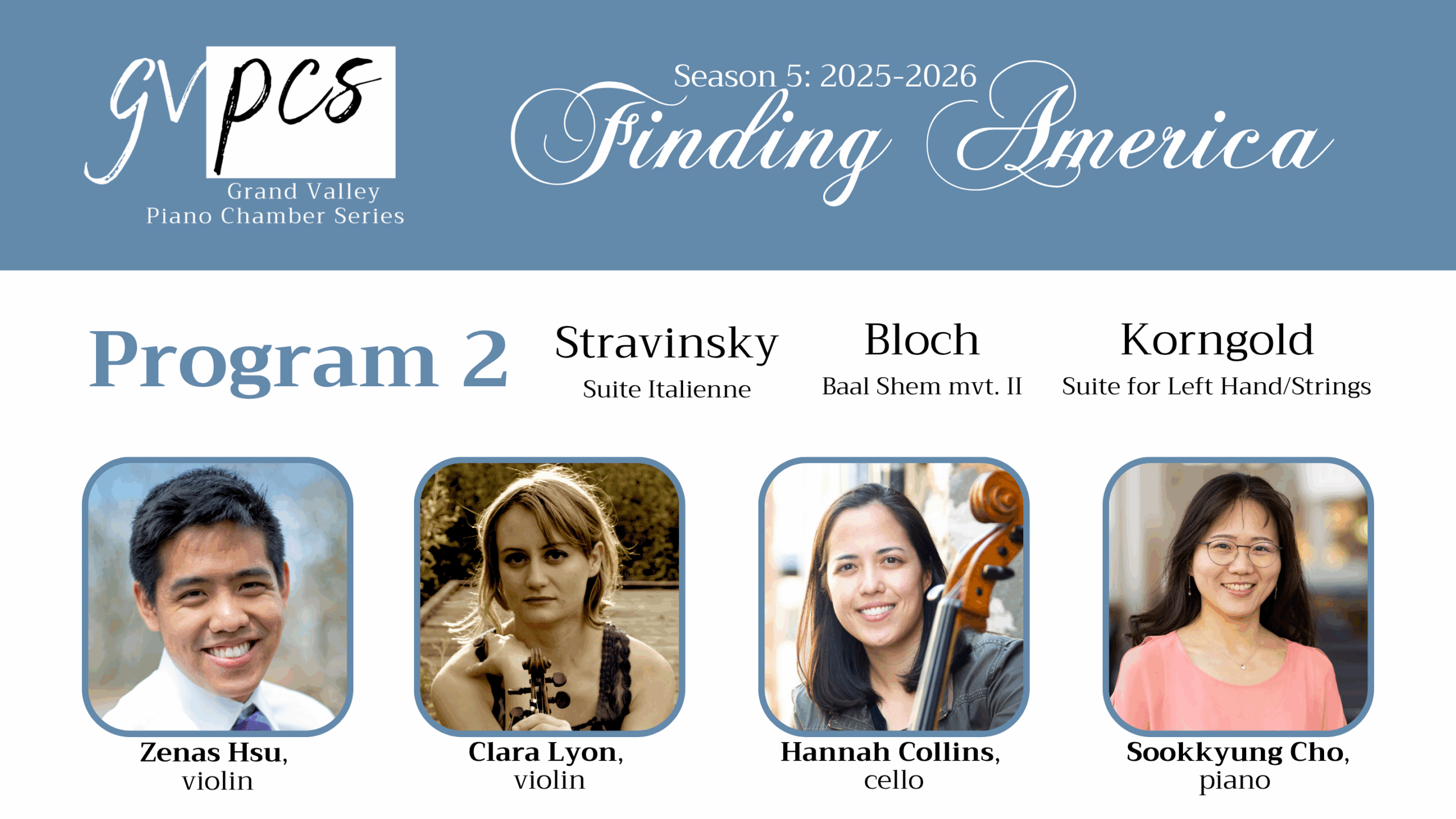 GVPCS celebrates America’s 250th anniversary with chamber music works by composers who made the United States their new home. This program at MMA features Igor Stravinsky’s Suite Italienne, Ernest Bloch’s Nigun from Baal Shem, and Erich Wolfgang Korngold’s Suite for Left Hand Piano and Strings, Op. 23.